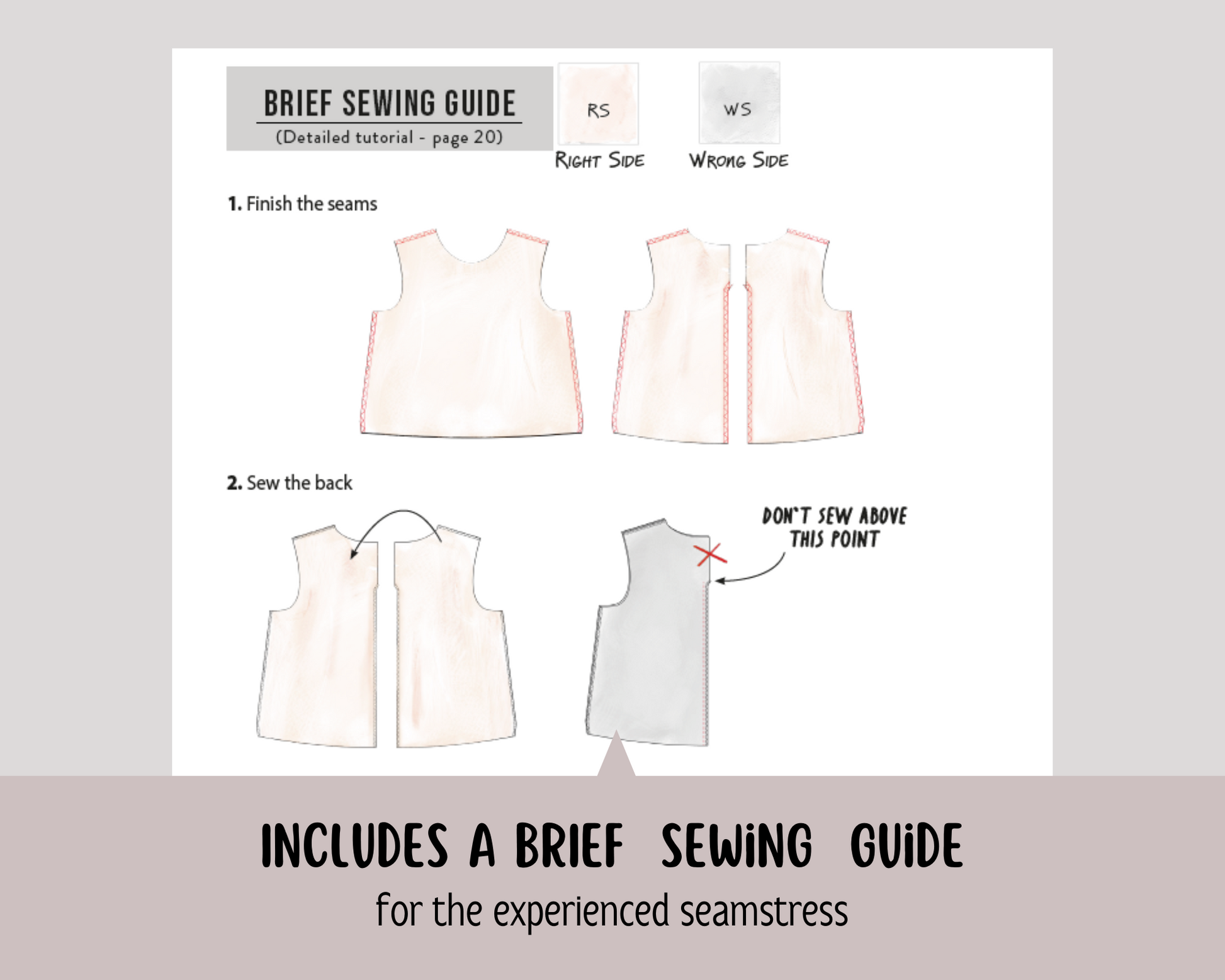 While simple in design, it requires finishing the armholes and neckline with bias tape, and sewing two buttonholes at the bottom. These elements can make it a bit challenging for sewing beginners. If you have any questions during the process, please contact me - I’ll be glad to help.