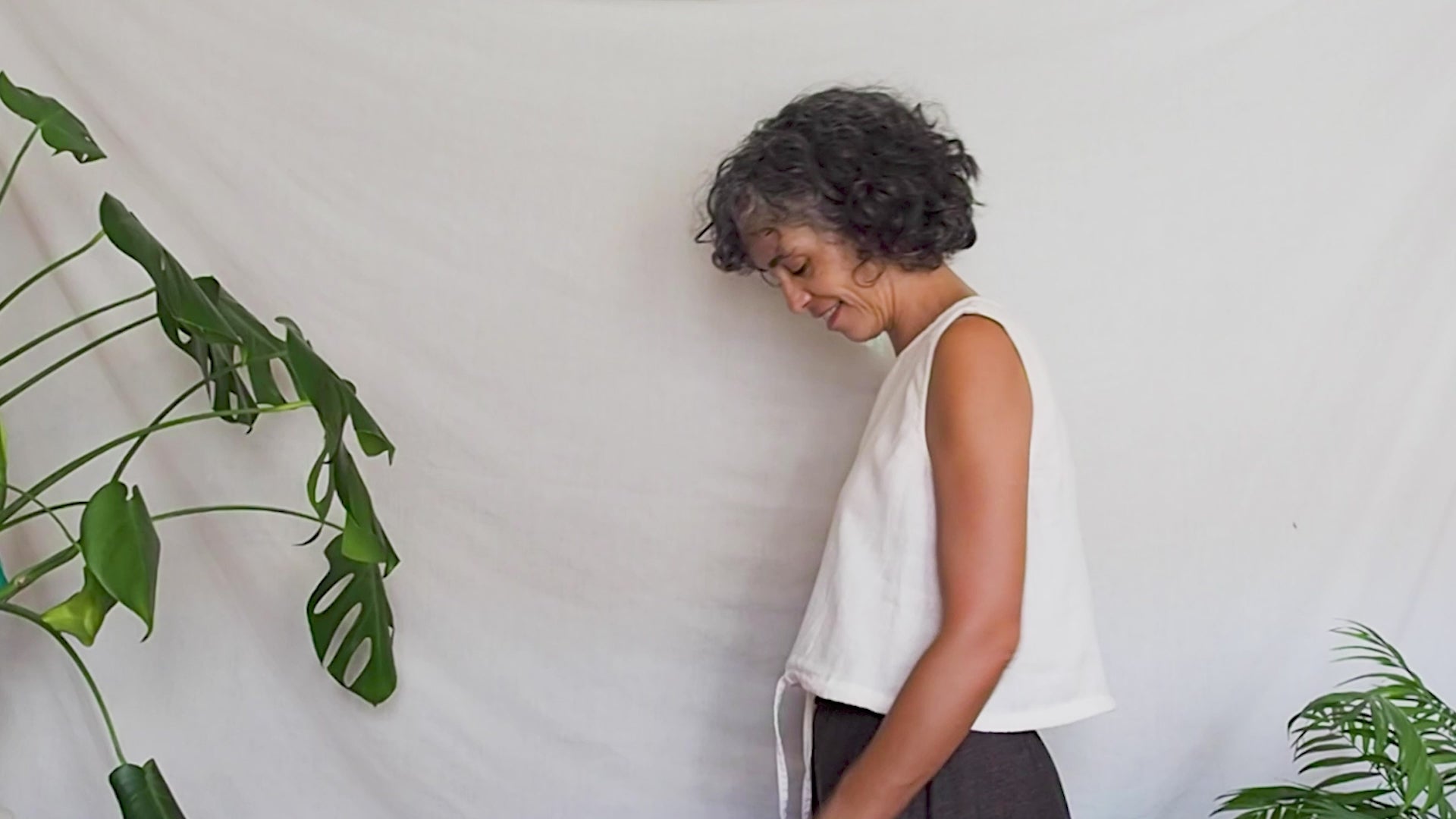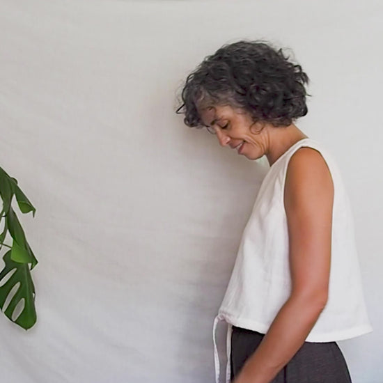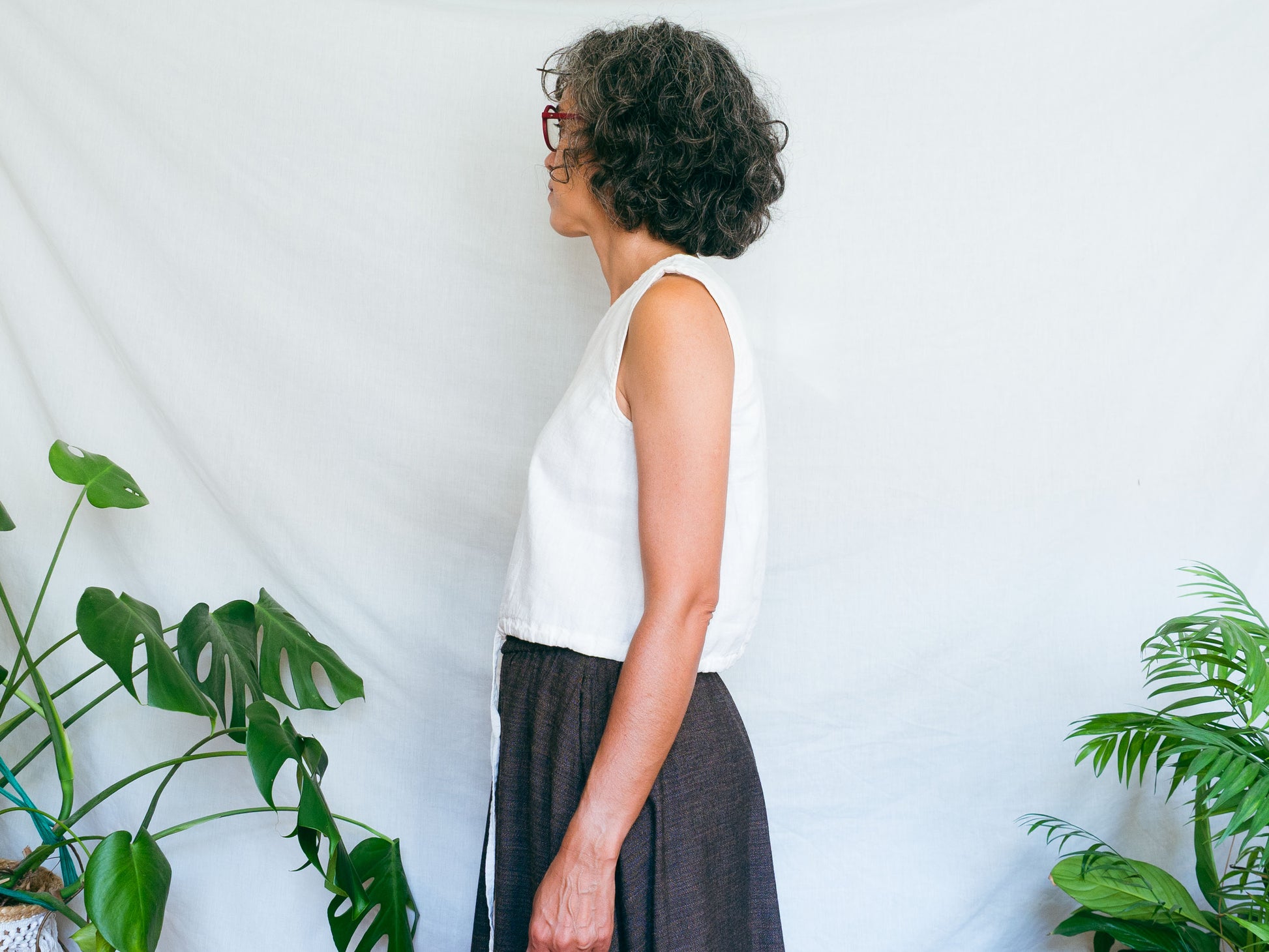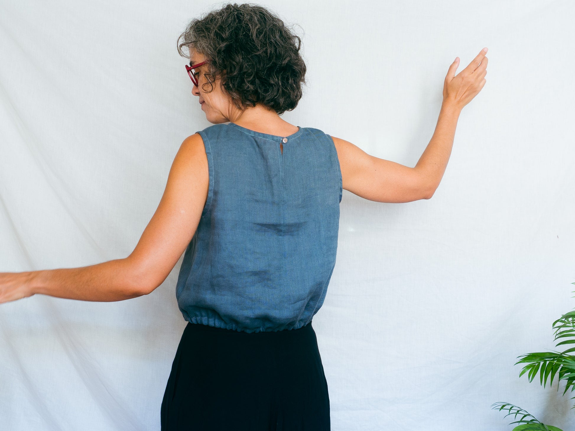 MAE is a basic sleeveless top, with a strap at the bottom that you can pull to achieve a ballon look. It is comfy, with a slightly loose fit, but not oversized.